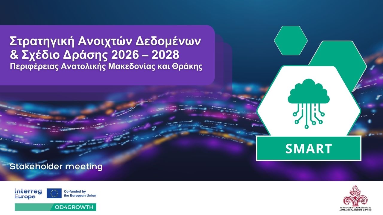 Την Παρασκευή 27 Φεβρουαρίου 2026 ολοκληρώθηκε η διαδικτυακή συνάντηση ενδιαφερόμενων μερών της Περιφέρειας Ανατολικής Μακεδονίας και Θράκης, με θέμα: «Στρατηγική Ανοιχτών Δεδομένων – Σχέδιο Δράσης 2026–2028 της Περιφέρειας Ανατολικής Μακεδονίας και Θράκης», στο πλαίσιο του διαπεριφερειακού έργου OD4GROWTH –INTERREG EUROPE. Στη συνάντηση συμμετείχαν φορείς της δημόσιας διοίκησης, της έρευνας, της επιχειρηματικότητας και της κοινωνίας των πολιτών.