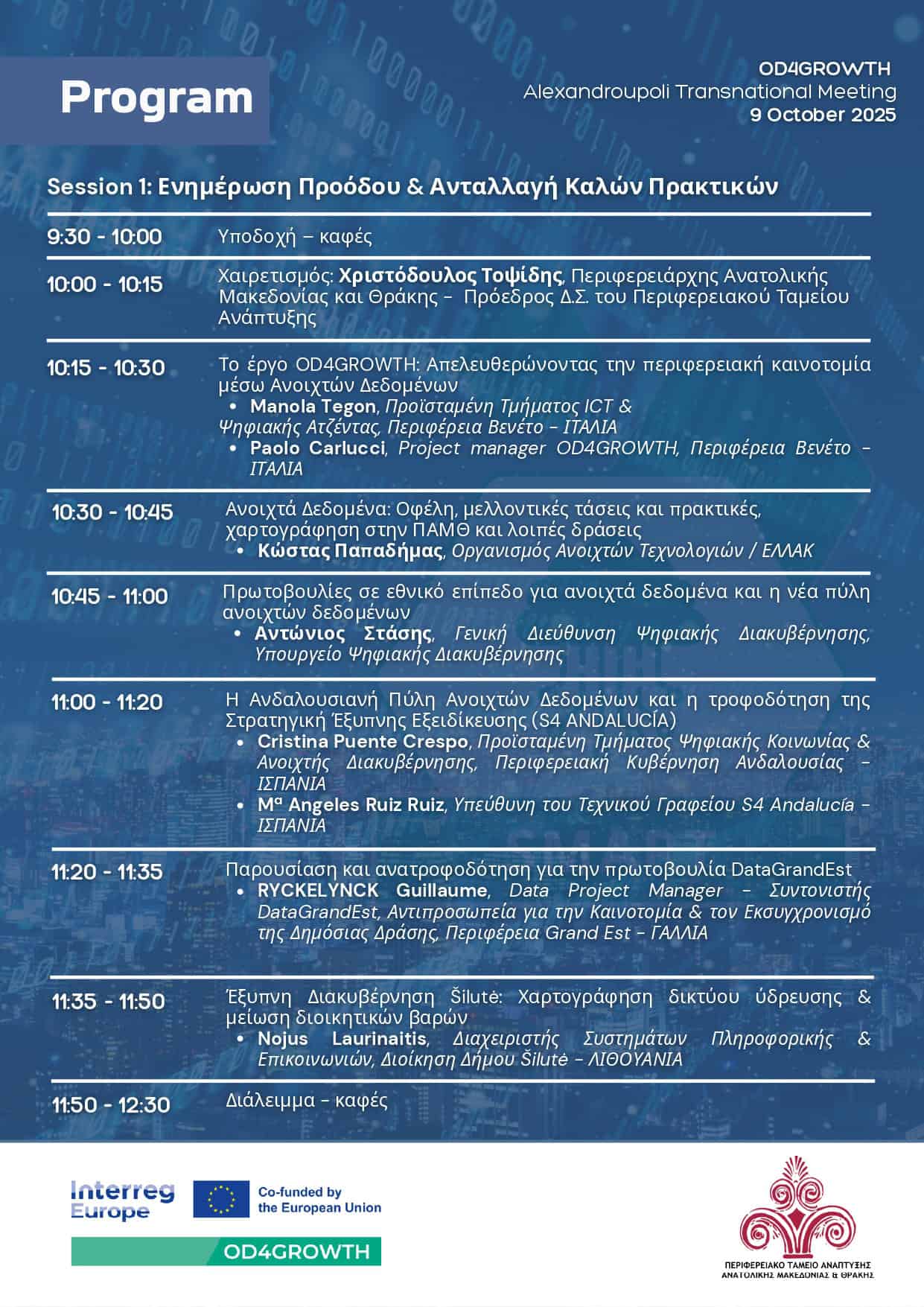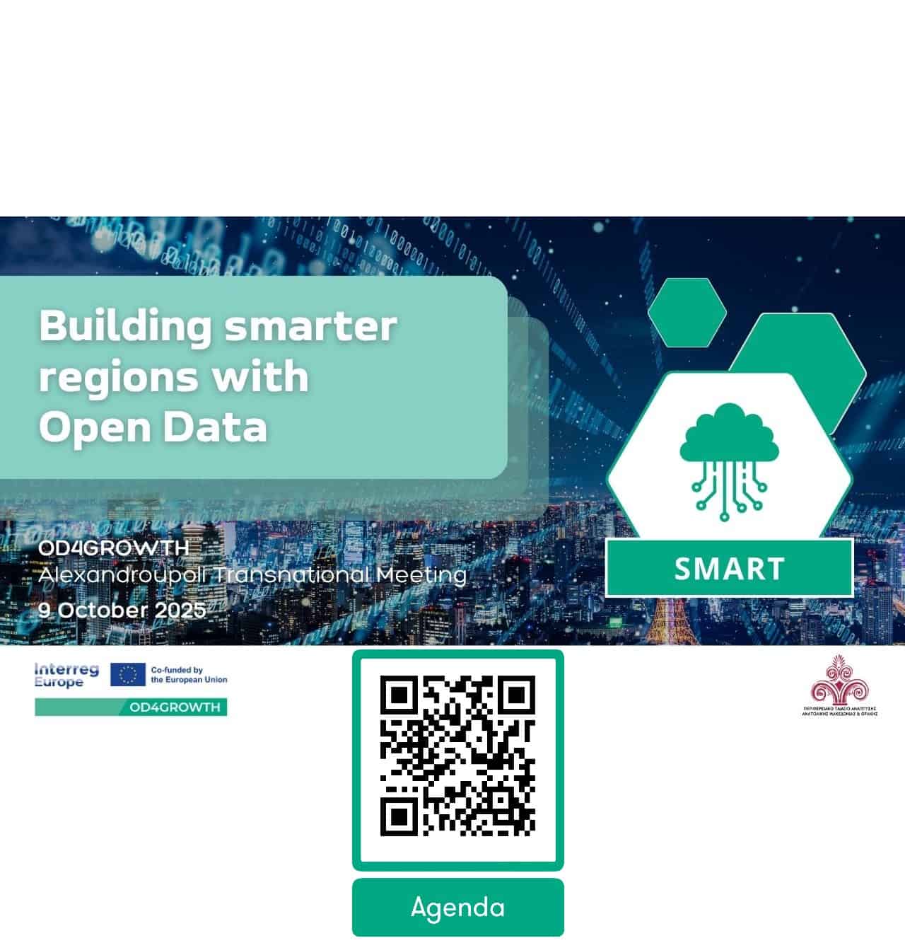 Το Περιφερειακό Ταμείο Ανάπτυξης Ανατολικής Μακεδονίας & Θράκης σας προσκαλεί στη διακρατική συνάντηση «Building smarter regions with Open Data – OD4GROWTH Alexandroupoli Transnational Meeting», που θα πραγματοποιηθεί στις 9 Οκτωβρίου 2025 στο Νομαρχείο Αλεξανδρούπολης.